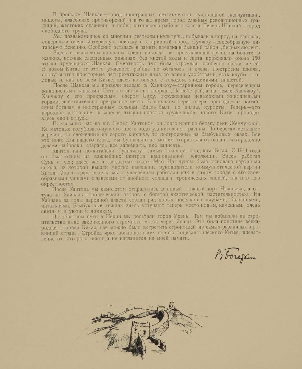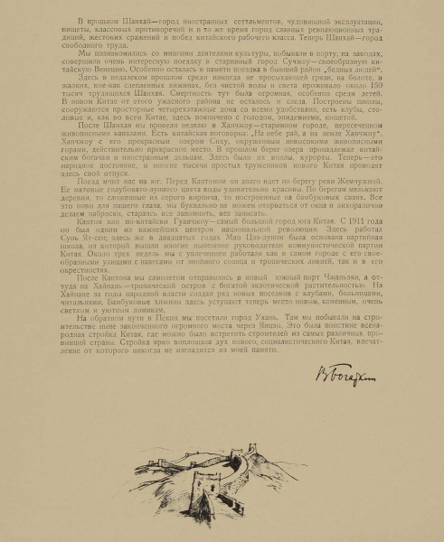 В конце ноября 1956 года группа советских художников, в которую входил Владимир Богаткин, выехала в Китай. «За три месяца пребывания там мы пересекли — с севера на юг — почти всю огромную страну. Суровые зимние краски сменялись щедрыми, до неправдоподобия яркими красками тропиков. В Китае каждая встреча с людьми самых различных профессий, каждый новый город или деревня укрепляли в нас чувство любви и уважения к народу-борцу, народу-созидателю». Богаткин В. В. Вступительная статья к альбому автолитографий «По Китаю». Комбинат графических работ. М, 1958.