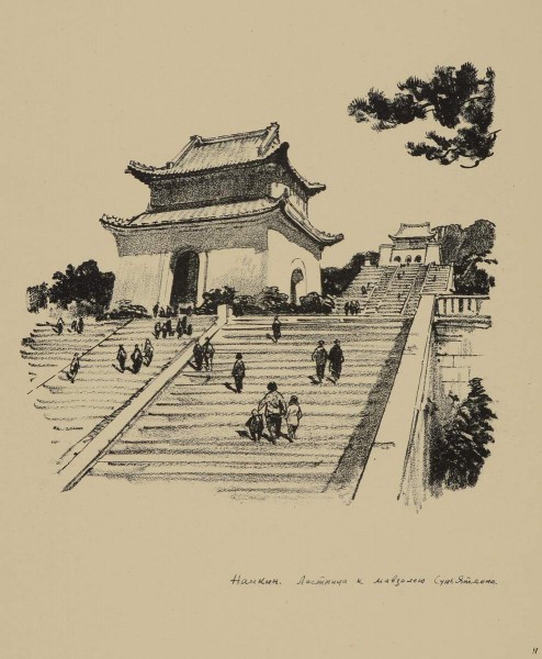 «После двухнедельного пребывания в Пекине мы двинулись в Нанкин, стоящий у зеленовато-желтых вод великой реки Янцзы. <...> Гостеприимные нанкинские художники показывали нам не только достопримечательности города, но и всe живописные окрестности, а также исторические, архитектурные и революционные памятники.