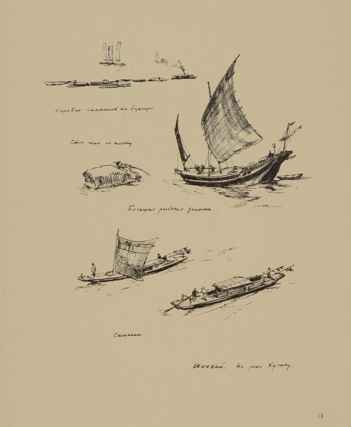 Шанхай — самый большой город Китая и один из крупнейших городов и портов мира. Почти сразу же за входным маяком по берегам растянулись верфи, пакгаузы, склады, заводы, дома. Здесь можно встретить суда самых различных наций...». Богаткин В. В. Вступительная статья к альбому автолитографий «По Китаю». Комбинат графических работ. М, 1958.