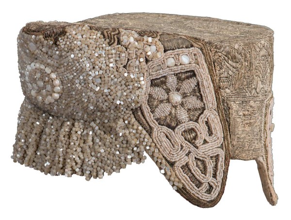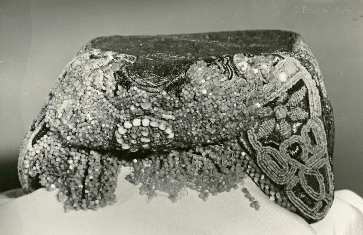 Удалены загрязнения. Иглой укреплены оборванные золотные нити. Укреплена и дополнена сеченым перламутром по рисунку поднизь. Утраты в верхней части кокошника дополнены перламутровыми плашками и крупным сеченым перламутром. Устранена сильная деформация.