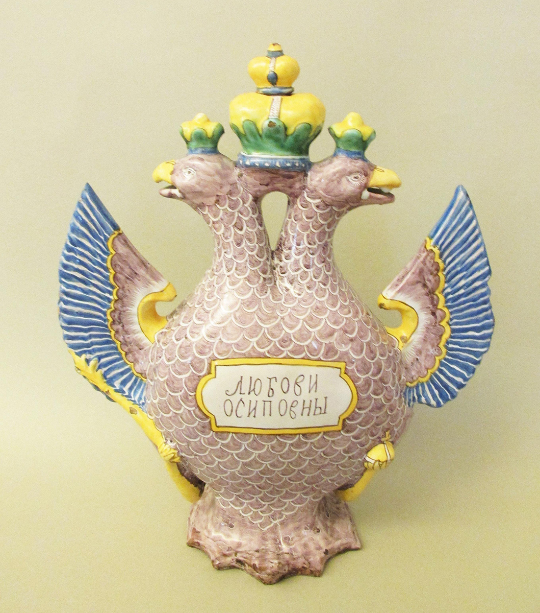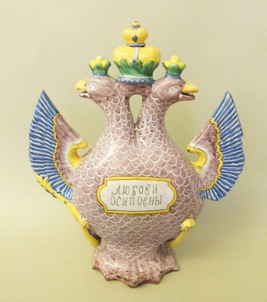 На этом сосуде, выполненном в форме двуглавого орла с тремя коронами, с одной стороны тулова в фигурной рамке расположена надпись: «Любови Осиповны», а с другой — изображение двух птиц по сторонам куста.