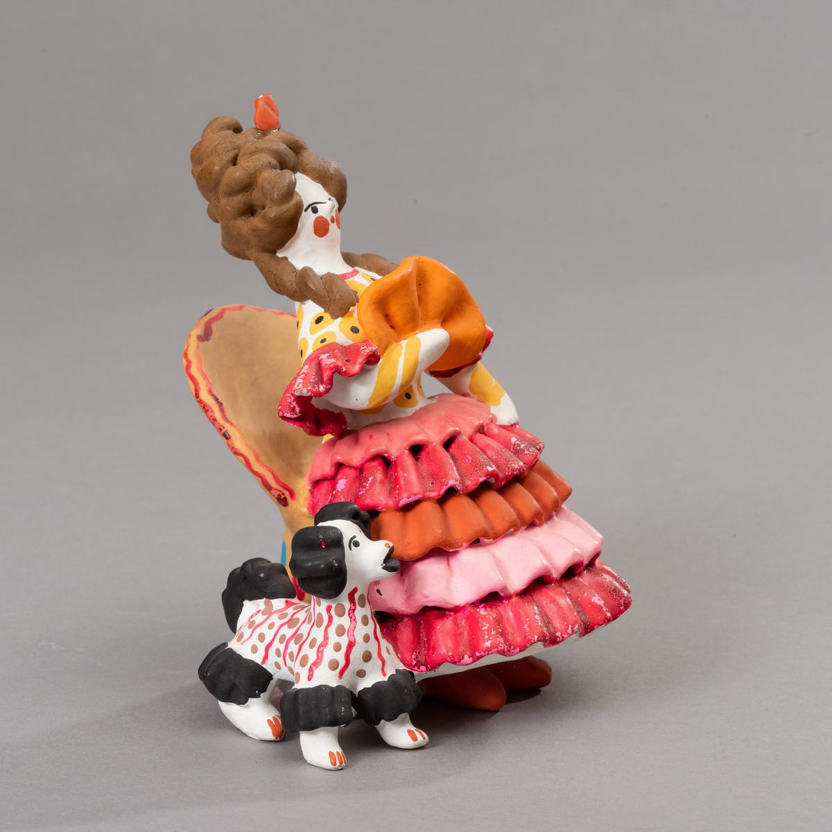 В самой известной — дымковской игрушке, древней по своему происхождению и связанной с местным весенним праздником Свистунья, среди наиболее ранних свистулек ХIХ века с включенными в них образами утиц, двуглавых коньков и всадников фигурки собак не встречаются. Но они уже присутствуют в перечне игрушек старейшей мастерицы промысла Анны Афанасьевны Мезриной (1853–1938), хранившей мастерство угасающей дымковской игрушки в 1910–1920-е годы. Как яркая деталь сцен городской жизни Вятки собачки включаются в основной арсенал традиционных образов промысла. Они органично дополняют традиционные сюжеты прогуливающихся пар, кокетливых дам под зонтиками.