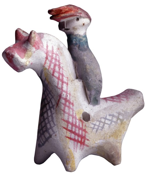 Один из самых популярных сюжетов в народной игрушке – всадник. Во многих районах сложился определенный тип коника-свистульки на коротких ногах с длинной шеей. Фигурка всадника без ног (а иногда и без рук) слита воедино с туловищем коня. Курские всадники вылеплены с предельной лаконичностью. Но, несмотря на простоту формы, свистульки села Кожля отличает большая выразительность и своеобразие.