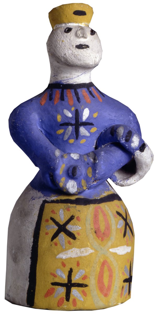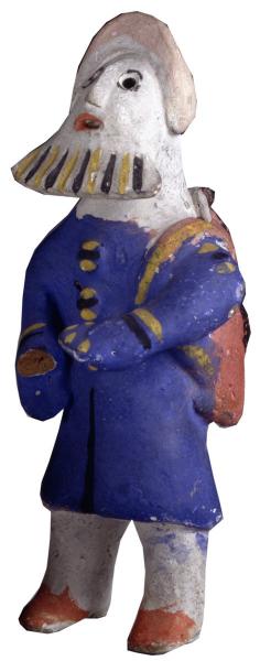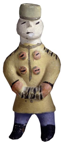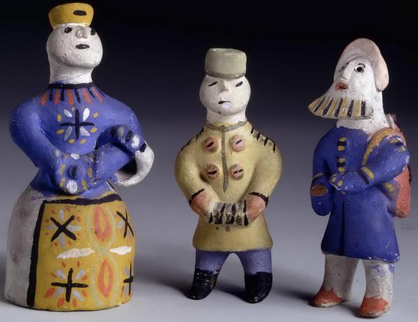 На севере в деревне Гринево Каргопольского района Архангельской области в 1930– 1940-е годы работал талантливый мастер, потомственный гончар И. В. Дружинин (1887-1949), с именем которого связан расцвет этого центра. В Русском музее хранится самая большая коллекция его игрушек, позволяющая показать самобытные особенности его авторской манеры. В произведениях Дружинина просматриваются разные источники, взаимосвязанные, но придающие особые оттенки его творчеству. Один из них, самый сильный и плодотворный – это реальный мир русской деревни. Отсюда в его небольших, грубовато вылепленных фигурках многочисленные крестьянки с птицами, корзинками, детьми на руках; дамы-модницы в нарядных платьях и замысловатых шляпках; мужики с трубками во рту, парни-гармонисты, солдаты с ранцами за спиной, путники с котомками, охотники с ружьями и добычей.