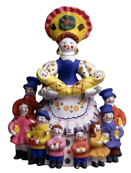 The Outstanding Dymkovo toys craftswoman Zoya Penkina possessed an inexhaustible purely folk invention and ingenuity. There is a peculiar naive immediacy in her sculptures, multi-figured compositions and whistles. Her characters look at the world with eyes wide open; they are akin to the sincere simplicity of the images of children's creativity.