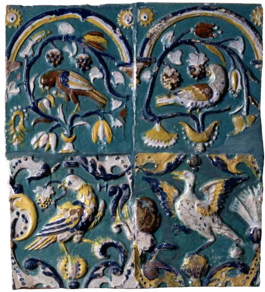 Расцвет искусства архитектурных изразцов приходится на XVII столетие, а печные достигают вершины развития в XVIII веке. Одноцветные зеленые или полихромные с рельефными изображениями клюющих ягоды птиц, сказочных Сиринов, единорогов, «лютого зверя» — грифа, царя Александра Македонского, изразцы оживляли наружные стены зданий и интерьеры XVII — первой половины XVIII века.