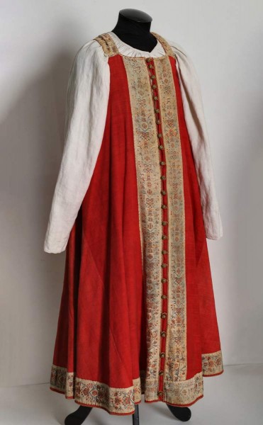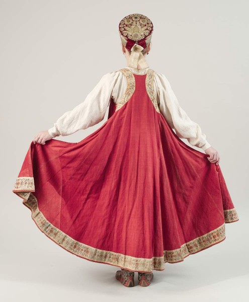 Красный сарафан уникален своим архаичным кроем: три прямых полотнища соединены на спине, на уровне лопаток, где и располагаются швы, в которые вставлены косые клинья — по шесть с каждой стороны. Подол сарафана образует почти полный круг. Он подпоясывался высоко под грудью, и его складки формировали удивительно красивый силуэт. Сарафан украшен по подолу, застежке и проймам шелковыми золотистыми лентами, которые напоминают о древних византийских одеяниях, изображенных в мозаиках и книжных миниатюрах. Во всех ты, душенька, нарядах хороша. Традиционный праздничный костюм XVIII — XX веков. СПб, 2015. С. 26.