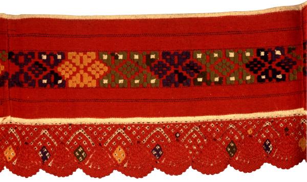 The chislennoe lace (a kind of woven lace with the simple repeated pattern) of the 19th century from the Mikhailovsky district of the Ryazan province are narrow, woven from thick coloured threads (they were called "plump paper"). The patterns of such lace cannot be called complex. Their variety is based on one or two coloured threads - white, yellow, blue, which were intersected, running through the red background. The lace was thick and translucent. It was woven without a preparatory drawing, the masters kept in mind the number of interlaces. In the old female costume from the city Mikhailovo they were sewn to "zakolotki" or motley woven stripes on the hem of shirts. The lace as well used to decorate the aprons – curtains.