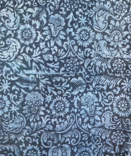 Графическое совершенство орнаментики XVII века особенно ярко проявилось в двухцветной сине-черной набойке. Нарядный и пышный узор отличается четкостью прорисовки деталей. Условные формы растений сочетаются с более конкретными. Плоды граната, многолепестковые цветы типа гвоздик и ромашек, барочные завитки густо покрывают поле холста. Благодаря изысканному сочетанию сдержанного синего тона узора с черным фоном набойка приобретает характер драгоценной ткани.