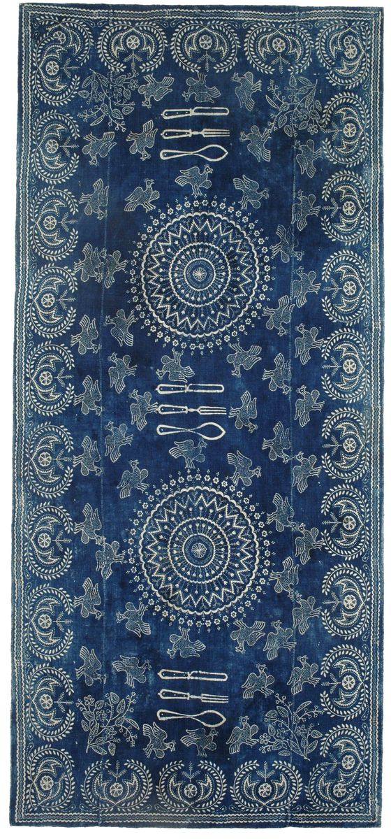 Кубовая набойка широко применялась в крестьянском быту: из нее шили рубахи и порты, передники и сарафаны, делали покрывала, скатерти. Последние стелили на стол только в большие народные праздники — на свадьбу, в период весеннего сева или жатвы. Поэтому орнамент скатертей был традиционным и включал обязательные круги-розетки, изображения птиц как олицетворение солнца, света.