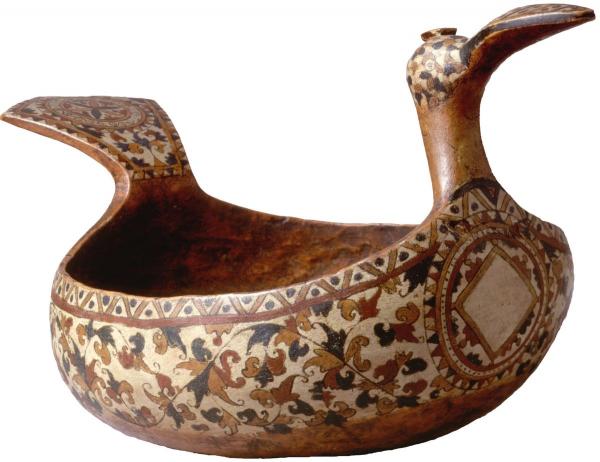 Painted two handled ladles in the form of the majestic floating birds are the earliest piece of Permogorsk painting in the museum’s collection. Fancy floral shoots tangle the walls of the ladle. Large geometric rosettes on the chest give monumentally solemn and at the same time symbolic character to the decoration. Rosettes in the form of a circle or a rhombus on the ladle are the solar signs, the remnants of an ancient pagan symbols, preserved on this ritual utensils.
