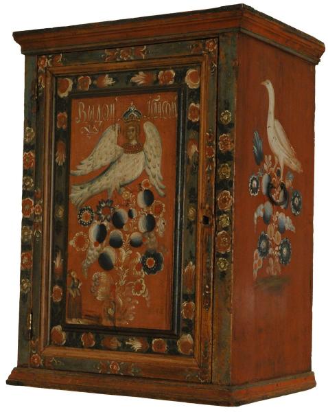 Подвесной шкафчик, демонстрирующий живописный тип росписей, был выполнен в Олонецкой губернии в конце XVIII века. Белоснежные голуби на кустах — на боковых стенках — и птица Сирин на райском древе с яблоками — на дверце — изображены красочными мазками, вплавлениями одного цвета в другой. Под деревом маленькая женская фигурка зачарованно внимает пению сказочной птицы. Роспись навеяна лубочной картинкой и отражает свадебную символику, которую подтверждают два окрыленных сердца, помещенные на внутренней стороне дверцы. В характере росписи чувствуется влияние светской живописи и иконописной культуры XVIII в. Такие предметы мебели расписывали на р. Выг в Олонецкой губернии.
