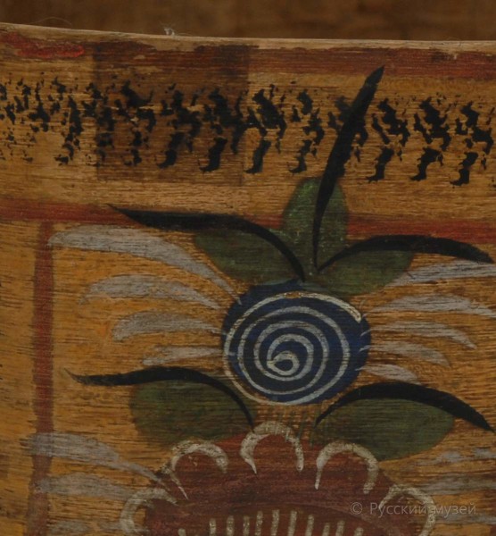 На мочеснике основные повреждения находились в нижней трети. Прослеживались деформации основы в местах стыков. Многочисленные летные отверстия жука-точильщика с внутренней стороны вдоль нижнего края. Имелись утраты поврежденной основы шириной. На уровне вкладного дна сквозной горизонтальный разрыв стенки луба длинной 46,8 см. Многочисленные утраты красочного слоя, с отслоениями по краю, от мелких выкрошек в верхней и средней частях до обширных, где часть росписи сохранилась фрагментарно. Неравномерный слой лаковой пленки с многочисленными потертостями сгустками и затеками. Плотные бытовые загрязнения, въевшиеся в лаковую пленку, сконцентрированные в углублениях и по текстуре основы.