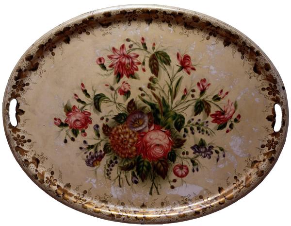 Несложная по рисунку форма подноса пропорциональна в своих размерах, обладает упругостью и пластичностью, благодаря работе коваля (кузнец), исполнившего ее вручную на наковальне. На белом фоне написан букет типичных для подносов того времени роз, вьюнков, георгинов, окутанных листьями и травками. Нежные оттенки розовых, голубых, сиреневых цветов, зелени листьев гармонируют с фоном цвета слоновой кости. Объединяет и завершает композицию золотистый узор из виноградных листьев и гроздьев, мягко стелющийся с борта подноса на его поле. Орнаментальная плоскость этой "уборки“ (так в Жостове называют обрамление на бортах) еще больше подчеркивает свободную непринужденную манеру живописи букета.