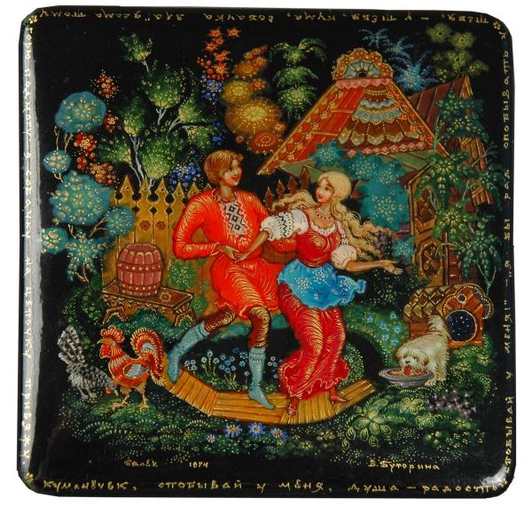 В миниатюрах на темы фольклора и литературных произведений сильно повествовательное начало. Каждая сценка, раскрывающая смысл куплета или строки песни, эпизода сказки или поэмы, включает множество конкретных деталей, занимательных подробностей. В этом направлении в 1970-е годы работает ряд мастеров, и особое место занимают произведения художниц-палешанок. В них интересны женские образы — то лирические, то озорные.