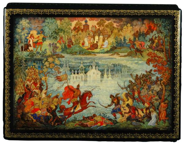 The miniature "The Legend of the Invisible City of Kitezh" is painted on the lid of a large rectangular casket. The counter motion of the antagonistic forces of Russians and Tatars is deployed around the lake. Through the streams and curls of the waves of the lake, one can see the blue-whitish sunken Kitezh. The poetic nature of the legend has found the appropriate expressive means. The theme itself is connected with the heroic past of Russia.