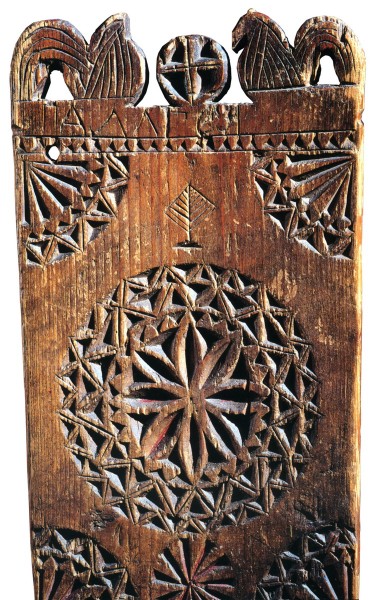 Прялки из Старицкого уезда на юге Тверской губернии сохранили наиболее архаичные черты и в конструкции, и в декоре. Это две доски, врубленные одна в другую под прямым углом. Стремясь облегчить прялку и разбить монотонность длинной доски, мастера превращали нижнюю ее часть в фигурную, состоящую из кругов, трапеций на круге. В иных прялках круг внизу как бы охватывается полумесяцем. Резьба на них довольно глубокая. Это розетки и различной конфигурации поля, заполненные мелкими порезками. В навершиях прялок можно встретить круг с крестом внутри и двумя птицами по сторонам, как бы сторожащими это солнце. А под этой скульптурной композицией на лопасти контуром вырезан еще один многозначный мотив, который можно понять как древо жизни. Только так и можно расшифровать фигурки петухов, круг и деревце, соотнеся их глубоко традиционные образы с известными нам древними символами.