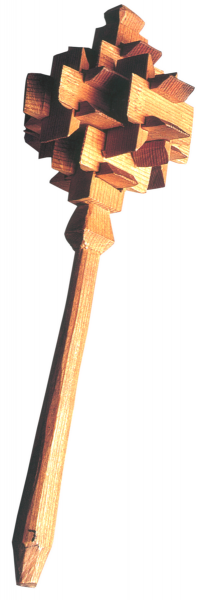 «Шаркунок» — местное название деревянной погремушки. Своеобразный ромбический объем, укрепленный на рукояти, составлен в замысловатую конструкцию из мелких фигурных палочек. Внутри катаются дробь или горох, производящие при движении шаркающий звук, от которого, вероятно, произошло и местное название. Красивые пропорции, природная, чаще неокрашенная фактура дерева, варианты в соотношении объемов и размеров палочек — все это придает занимательной детской игрушке качество произведения искусства.