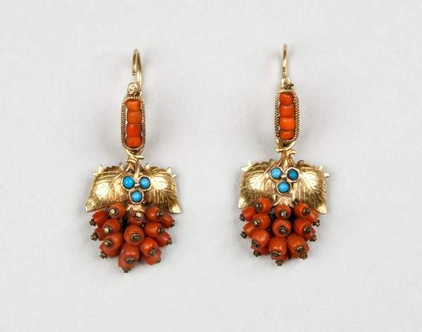 Серьги — украшение, известное со времен Древней Руси. Для изготовления серег использовали серебро, медные сплавы, олово, кость, бисер. В металле применяли технику литья, чеканку, накладную скань, зернь, гравировку. Золотые и серебряные серьги украшали цветной выемчатой эмалью и драгоценными камнями. Нижний край серебряных серег иногда дополнялся шумящими подвесками. Были распространены формы растительного характера — серьги в виде веточек с гроздьями жемчуга, граната, коралла, цветного стекла, напоминающими плоды смородины, винограда. Для жителей Севера и Верхнего Поволжья излюбленным дополнением праздничного наряда служили жемчужные серьги. Редко встречаются серьги в виде гроздьев ягод с цветами и листьями, вазонов с цветами. Во всех ты, душенька, нарядах хороша. Традиционный праздничный костюм XVIII–XX веков. СПБ, 2015. С. 107.