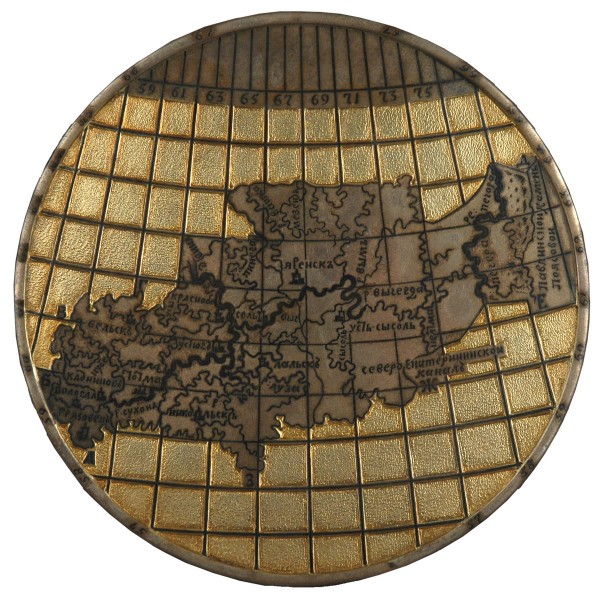 На круглой плоской крышке в обрамлении крупной черневой сетки меридианов и широт на золотом фоне помещена карта. На серебряном фоне чернью тщательно прорисованы реки, проставлены их названия, города обозначены миниатюрным контуром строений, церквей и крепостных башен. Заглавными буквами отмечены на карте участки границ с соседними землями, перечень которых указан на оборотной стороне табакерки. Там же содержатся интересные подробные данные о Вологодской губернии: число городов, деревень, количество и состав населения и т. д. На боковых стенках размещены гербы уездов. Географические сведения, цифровые данные составляют художественное оформление вещи. Простота формы табакерки, строгая логичность орнаментации отвечали требованиям времени — суровому рациональному стилю классицизма.