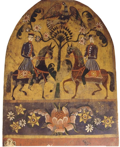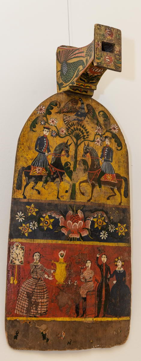 В росписи объединены два круга характерных тем. В верхней половине изображено древо с птицей на вершине и всадники по его сторонам. Это свадебный цикл сюжетов, тесно взаимосвязанный с местным фольклором. Его содержание трактуется как символическая «охота» жениха и дружки на невесту, величавшуюся в свадебных песнях «лебедушкой». Цветущее дерево — символ вечного обновления жизни — стало и обозначением сада, в котором невеста ожидает своего суженого («Не из терема ли вывели, не в зеленый сад поставили»).