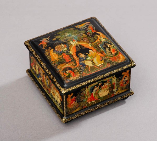 Художники лаковой миниатюры традиционно обращались к нескольким <сюжетам>: «Сказка о царе Салтане», «Сказка о мертвой царевне и о семи богатырях», «Сказка о золотом петушке», «Сказка о рыбаке и рыбке», нередко изображая героев всех сказок на стенках ларцов, а на крышке – персонажей пролога к поэме «Руслан и Людмила».