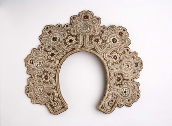 Самой драгоценной частью народного костюма были головные уборы, особенно свадебные. Девичьи уборы типа корон или повязок и женские с непременно закрытой тыльной частью тщательно украшали низанием речным жемчугом, сеченым перламутром и бисером или шитьем золото-серебряными нитями. Шитье дополняли вставками камней и цветных стекол. Головные уборы берегли и передавали из поколения в поколение, благодаря чему сохранились экземпляры XVIII века. Почти в каждой местности сложились свои традиционные формы, приемы и способы украшений головных уборов. Так, в Нижегородской губернии девушки носили красивые повязки, а женщины — большие серповидные кокошники; в Костроме форма кокошника похожа на стрельчатую арку.
