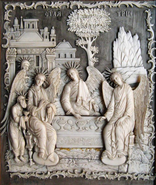 С XVI века Холмогоры – известный центр костерезного искусства на Русском Севере. XVIII столетие – период расцвета этого промысла, когда изготавливалось множество утилитарных предметов (ларцы, бюро, шкатулки, вазы, кубки, веера, гребни, игольники), а также предметы церковного обихода – иконы, распятия, кресты. Мастера в совершенстве овладели разнообразными техническими приемами обработки кости: ажурная и рельефная резьба, цветная гравировка естественно сочетались в одном произведении. В резьбе костяных икон холмогорские мастера использовали широкий круг источников из русского и западноевропейского искусства. Особенно часто за образец брали гравюры из Библии Пискатора. Беря за основу ту или иную гравюру или икону, резчик творчески их перерабатывал, учитывая свойства драгоценной кости мамонта и моржового клыка, а также тенденции господствующего большого стиля в искусстве. Так, орнамент, окаймляющий икону „Троица“ XVIII века, составлен из крупных завитков раковины, объемно моделированных. В иконе „Тайная вечеря“ начала XIX века рокайль уступает место классицистическим цветочным гирляндам, венкам на фоне тонкой сетки, рядам бусин. Для холмогорской резьбы по кости характерно сочетание народных традиций и высокой культуры профессионального искусства. Маргарита Захарова // Иисус Христос. СПб, 2000. С. 192.