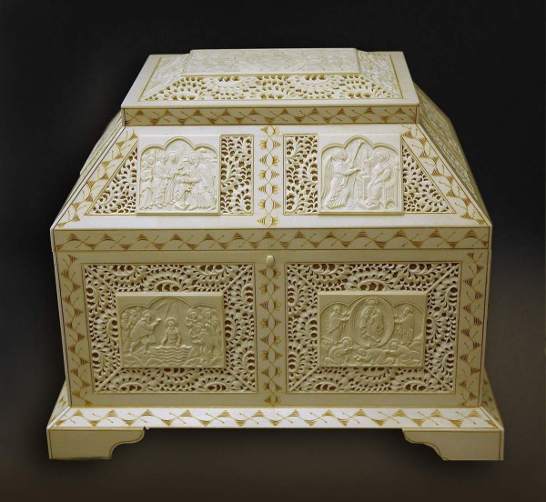 - Дерево, цевка, кость мамонта, резьба рельефная и ажурная, цветная гравировка. 28,6 х 23,6 х 23,4