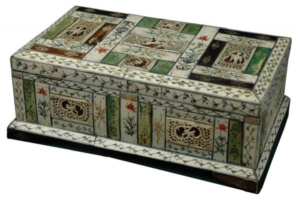 • кость, гравировка с подцветкой и позолотой, сквозная и рельефная резьба. 10 х 17 х 28,5