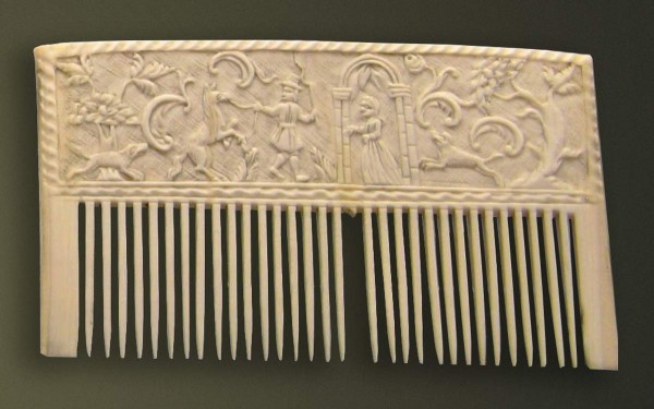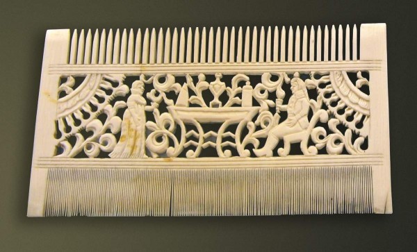 Знаменитый холмогорский рокайль, крупный, объемно моделированный, очевиден в гребне второй половины XVIII века. Он осеняет сцену застолья с фигурами дамы и кавалера в европейских нарядах. Гребни были очень распространенными холмогорскими изделиями.