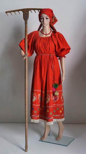 In some regions (Arkhangelsk, Vologda, Yaroslavl gubernias) shirts worn when working in the fields, or when doing other work, were named accordingly — pokosnitsa (reaping), rybolovka (fishing). Reaping and mowing shirts were often worn without a sarafan or its hem was lifted up and tucked into the girdle to better display the patterns on the shirt.
