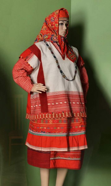 В среднерусских и южнорусских деревнях женский наряд отличался от одежды северянок. Замужние женщины носили не сарафан, а поневу — архаичный предмет крестьянского костюма. Наряд молодых женщин Калужской, Тульской, Орловской, Рязанской, Тамбовской, Воронежской губерний представлял собой редкое по красочности явление. В каждой местности, костюм выделялся своеобразием покроя и колорита, необычной формой предметов, головных уборов и украшений. Костюмы были многослойны. Сверкающий галун и шелковые ленты, яркие шерстяные кисточки и шарики, цветные бисерные украшения от макушки головы до подола одежды — это «верхний слой». Рукава рубах от плеча до запястья покрыты ткаными, вышитыми, лоскутными узорами. Подол рубахи, который виден из-под края поневы, отделан цветным кружевом или узорной каймой. Значим в костюме богатый декор поневы — вышивка, золотное кружево, тесьма, галун. Оригинальностью формы и украшений отличаются передники, иногда с рукавами, но чаще — без них, длинные — их нижний край ниже подола поневы. Передники сзади распашные, со своеобразным «окошком» на лопатках. Короткие свободные «навершники», «насовы», «голопузики» — как правило, без рукавов или на лямках — завершают сложную многоступенчатую композицию костюма. Во всех ты, душенька, нарядах хороша. Традиционный праздничный костюм XVIII-XX веков. СПБ, 2015. С. 147.