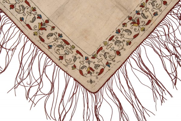 The bride is holding an embroidered snow-white rectangular linen kerchief ‑ a shirinka. The delicate North Russian shirinka was know as podavalnaya (“proffered”) as the bride would pass it to her new husband and the matchmaker would tie it to his hat.