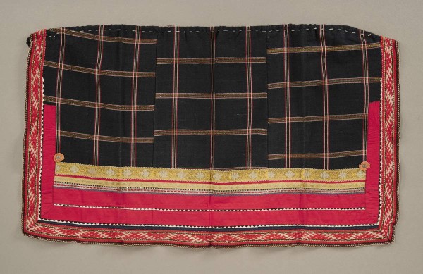 An open-front ponyova is a rectangle sewn from three cloth panels. Every locality had its own way of wearing it: with one or two laps tucked into the sash making a type of “bag” at the back which was sometimes smoothed out somewhat or, on the contrary, left sticking out, in which case it was known as a “nozzle” (Svyatsky 1910). The ponyova was decorated in one part on the outside, and in another, on the inside. The wrap-over ponyova was worn with an apron in front. However, when peasant women went to town they untucked the ponyova laps as it was considered shameful to go to town with them tucked in.