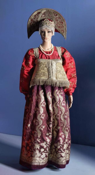Богатый городской костюм в Нижегородской губернии в XIX веке обычно шили из дорогих тканей фабричного производства: парчи, бархата, штофа, шелка. Он сверкает золото-серебряными узорами, вытканными или вышитыми на разных предметах, от головы до пят. Любимый мотив орнамента золотного шитья — гроздья винограда, розы и гвоздики, букеты, обвитые вьющимися травками. Огромные лопатообразные кокошники из бархата, отделанные галуном и золотным шитьем иногда достигают размаха «крыльев» до 60 см. Во всех ты, душенька, нарядах хороша. Традиционный праздничный костюм XVIII–XX веков. СПБ, 2015. С. 65.