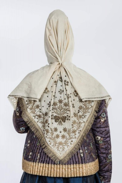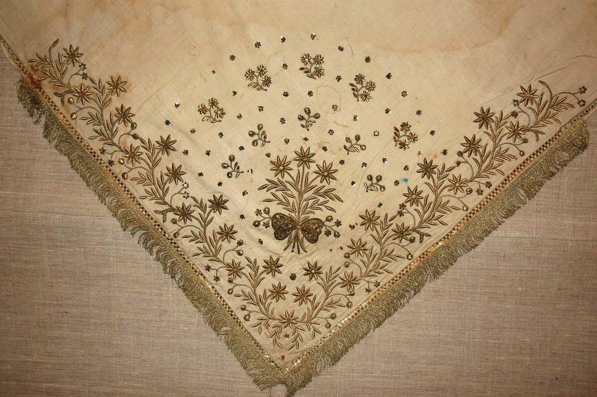 - Белое полотно, золотное шитье по карте и тамбуром, блёстки, золотная бахрома. 112 х 112