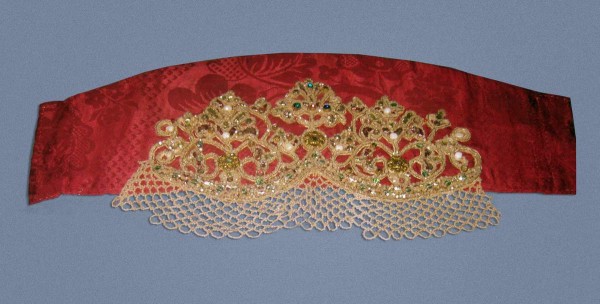 Head ornaments for girls — headbands, crowns and pochyoloks — were decorated with small freshwater pearls or chopped (broken) mother of pearl. For this, small pearls, mother-of-pearl pieces and beads were strung on strong linen thread or horsehair, the latter being more flexible. This type of work is called nizanye, or “stringing”. These strings were used to make the festoons of the headdress’ hanging lower fringe, or podniz, which covered the forehead to the eyebrows. On cut-out (openwork) crowns, the strings of pearls were couched to a white linen cord laid down beforehand to provide greater relief. This method was called sazhenye, or “seating”.