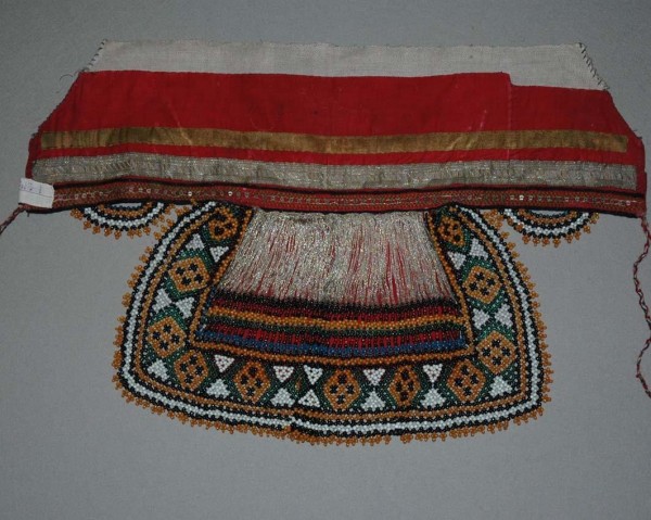 - Fabric, red calico, silk, passementerie, wool threads, metal thread, spangles, beads, embroidery, stringing. 51 х 33