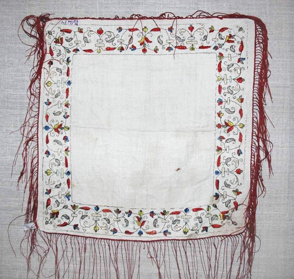 - Полотно, шелк, металлическая нить, двусторонняя гладь. 70 х 70 с бахромой