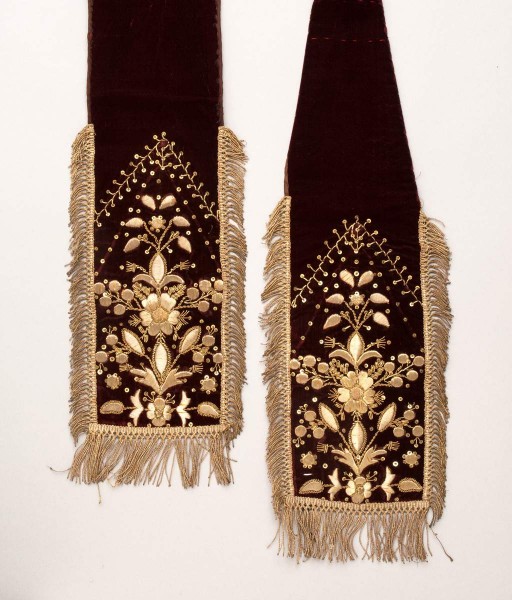 Home page Online resourcesCollectionsFolk Art Ribbons Ribbons Torzhok (?), Tver Gubernia. 19th century Velvet, gold embroidery, fringe. 9 х 85 В-6484 Period Early 19th century Typology / subtypeFolk costume | Gold and pearl sewing | Embroidery Keywords Folk costume | female costume Virtual exhibitions and 3d-tours Virtual tour "Women's Folk Costume in Russia. 18th-20th centuries" Share «Виртуальный Русский музей» в социальных сетях: