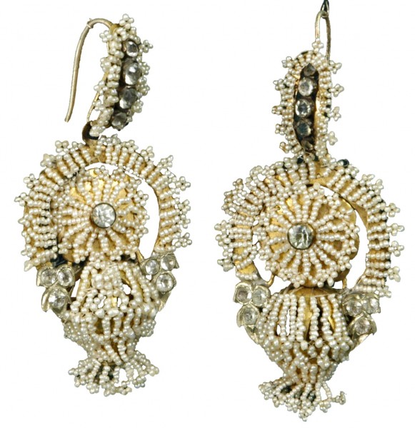 Earrings have been around since Ancient Russian times. Earrings were made of silver, bronze alloys, tin, bone and beads. The metal was cast, stamped, filigreed, grained and engraved. Gold and silver earrings were decorated with colorful rough enamel and precious stones. Noisy dangling pieces were sometimes hung on silver earrings. Plant shapes were common among the local people — earrings shaped like branches with clusters of pearls, garnets, coral, colored glass resembling currants and grapes. The inhabitants of the North and the Upper Volga Region loved adding pearl earrings to their festive attire. The most common types were in the form of butterflies with open wings. Small pearls or beads were threaded onto firm horse hair to preserve their shape, woven around a thick brass pendant. Some earrings were shaped as clusters of berries with flowers and leaves, or pots of flowers, but these were not common.