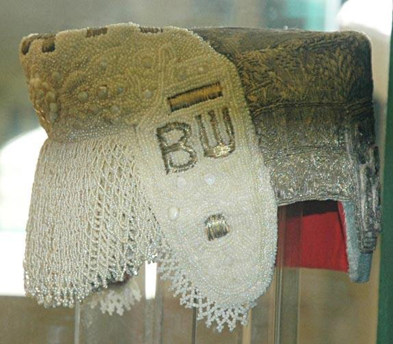 In the Kargopol District the gold embroidery on headscarves and the pearls and beads sewn onto headdress were done to order by the best craftswomen. The Kargopol kokoshnik has a specific shape — its ochelye with a thick podniz— a pearl net ring hanging over the forehead, is where it gets its nickname of “horned” from. All parts of the headpiece are embroidered either with cubes of crushed mother of pearl or matt pearls.