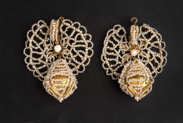 Серьги — украшение, известное со времен Древней Руси. Для изготовления серег использовали серебро, медные сплавы, олово, кость, бисер. В металле применяли технику литья, чеканку, накладную скань, зернь, гравировку. Золотые и серебряные серьги украшали цветной выемчатой эмалью и драгоценными камнями. Нижний край серебряных серег иногда дополнялся шумящими подвесками. Были распространены формы растительного характера — серьги в виде веточек с гроздьями жемчуга, граната, коралла, цветного стекла, напоминающими плоды смородины, винограда. Для жителей Севера и Верхнего Поволжья излюбленным дополнением праздничного наряда служили жемчужные серьги. Наиболее распространенный тип серег — «бабочки» с расправленными «крыльями» — лопастями. Мелкие жемчужины или бисер нанизаны на упругий конский волос, позволяющий сохранять форму, оплетают объемную латунную подвеску. Редко встречаются серьги в виде гроздьев ягод с цветами и листьями, вазонов с цветами. Во всех ты, душенька, нарядах хороша. Традиционный праздничный костюм XVIII–XX веков. СПБ, 2015. С. 107.