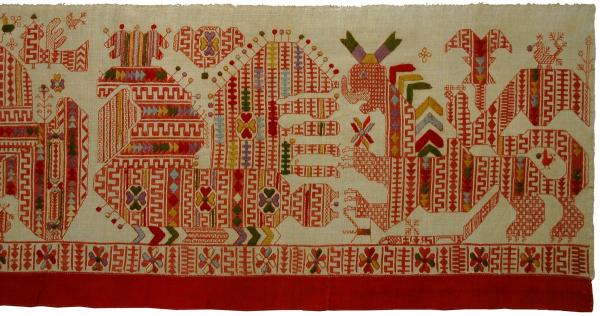 - Вышивка набором красными бумажными нитями и цветной шерстью по льняному полотну. В-527