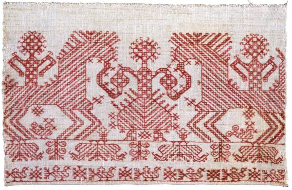 According to the iconography the oldest pieces of embroidery are usually made with red threads only. Red colour once had a symbolic meaning. The composition in such embroideries usually consists of three simple figures, the main one located in the centre and the subordinated figured are on its sides. The images are not detailed. The geometric pattern conveys the most general features of a human figure with a rhombic head, raised hands that look like hooks and a triangle skirt. Birds and horses are always depicted in profile, human figures in the front. The images are immovable, but at the same time they have hidden tension inside. The compositions are usually solemn and monumental. The images are full of significance and poetic fiction.