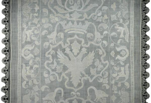 Уникальный столешник (скатерть) типичен для искусства XVII века. Его длинное узкое полотнище расшито орнаментом, выделяющим широкое поле середины и кайму, отороченную со всех сторон плетеным кружевным краем. В семи фигурных медальонах помещены изображения птиц сиринов, крупного цветка под короной, а вокруг них среди завитков растений — порхающие и клюющие ягоды птицы, длиннохвостые павы, лебеди, сирины, плывущие рыбы. Черты времени в этом произведении проявляются в пышном узорочье, плотно заполняющем все поле ткани; в мотивах орнамента, где главенствуют образы, типичные для Древней Руси; в динамичном характере линейного рисунка, передающего барочные формы XVII века; в виртуозном мастерстве исполнения. Столешник вышит приемами золотного шитья, пришедшими в народное искусство вместе с другими традициями древнерусской культуры. Их геометрическое строение, мелкозернистая структура и поразительное разнообразие рисунка придают белому шитью по белому тонкому полотну рельефную фактуру и богатую светотеневую игру.