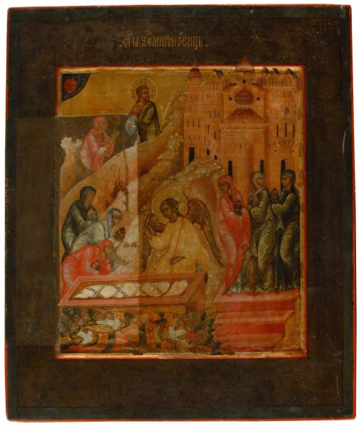 Сюжет передает евангельский рассказ о явлении ангела женам Марии Магдалине, Марии Иаковлевой и Саломии, пришедших на третий день после распятия с благовонными маслами (миром) ко Гробу Господню, чтобы по древнееврейскому обычаю умастить Его тело.