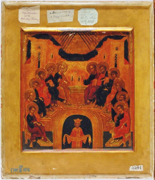 - Дерево, левкас, темпера (таблетка заключена в деревянное обрамление). 36,0 х 31,0 х 2,3