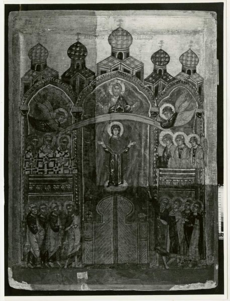 Изображен пятиглавый храм, в алтаре которого совершается чудо явления Богоматери "на воздусе". Над ней – ангелы, держащие киноварный покров, а выше – благословляющий Спас. По сторонам – святители и ангелы. Апостолы, Андрей Юродивый с Епифанием созерцают чудо, стоя у закрытых Царских врат. По-видимому, истоки этой иконографии связаны с храмовым образом из церкви Покрова Зверина монастыря в Новгороде, созданным в XIV в. Икону отличает своеобразный колорит – насыщенный зеленый цвет храмового пространства, на котором развернута сцена. Зеленый цвет интерьера храма встречается и в некоторых других иконах, написанных провинциальными иконописцами. Примером может служить икона на тот же сюжет конца XVI – начала XVII в. (ГРМ, ДРЖ-3159). По-видимому, зеленый цвет храмового интерьера символизирует присутствие в церкви Святого Духа, о чем неоднократно упоминается в текстах службы на Покров, где церковь, в которой является Богоматерь, сравнивается с "богонасажденным раем", местом, "напояемым Духом Святым". "Освящается небо, и земля, церковь же светится, и людие вси веселятся". Зеленый цвет, согласно древнерусским представлениям, яляется символом Святого Духа, все оживляющего и оживотворяющего.